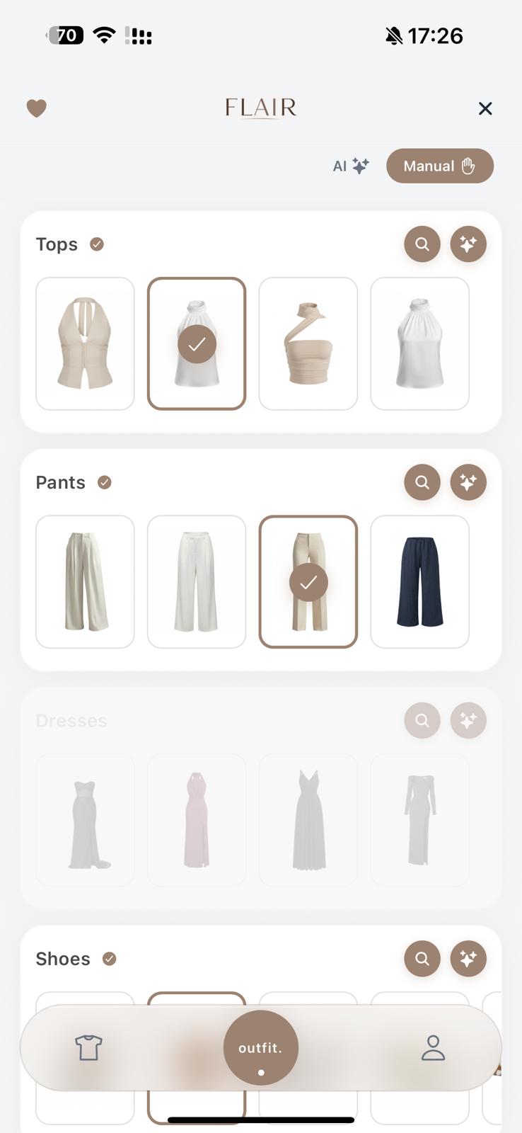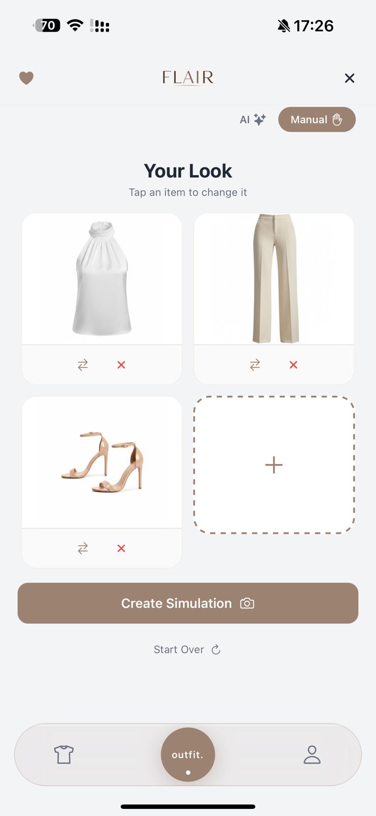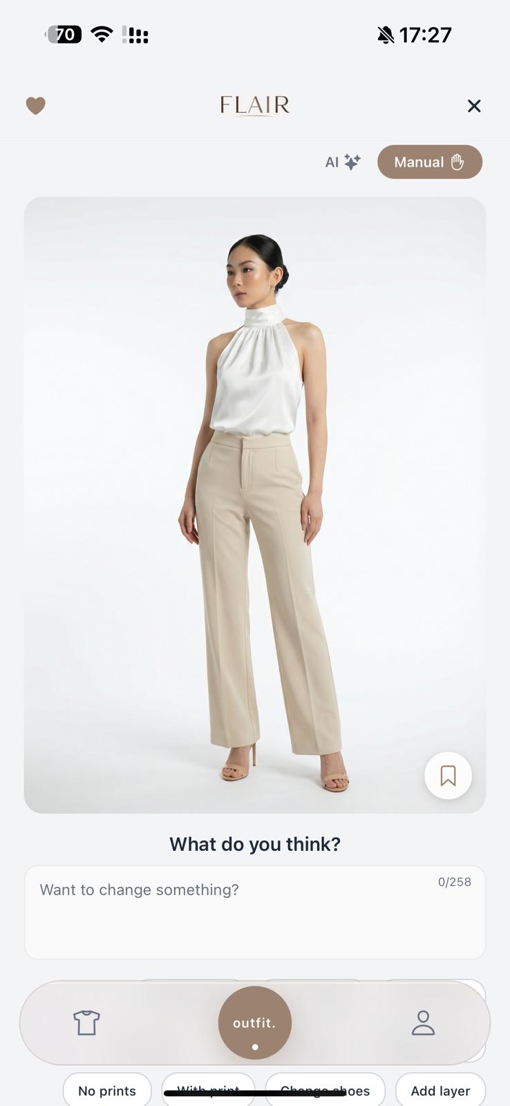 20 שניותהאפליקציה מרכיבה לוק ומראה אותו על המודל שלכם. לא מתאים? מחליפים פריט בלחיצה. מושלם? שומרים ויוצאים.